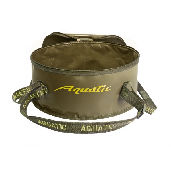 Ведро для замешивания рыболовного корма Aquatic (с крышкой). Складное ведро для прикормки Aquatic - необходимый атрибут любой рыбалки. Данная модель имеет крышку на молнии, а также плечевой ремень для транспортировки. Такое ведро отлично подойдет для замешивания прикормки, хранения прикормки, рыбы и т.д. Особенностью ведер Aquatic, является жесткое кольцо из пружинистой стали, что помогает облегчить процесс приготовления прикормки.