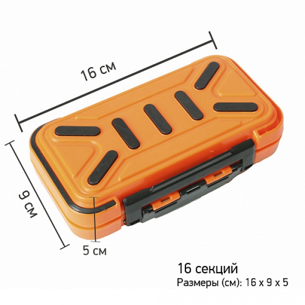 В представленном контейнере комфортно хранить и транспортировать рыболовные крючки, карабины, вертлюжки, разнообразную фурнитуру и другие предметы. Разделение по отделам позволяет исключить путаницу, увеличивает скорость работы со снастями.