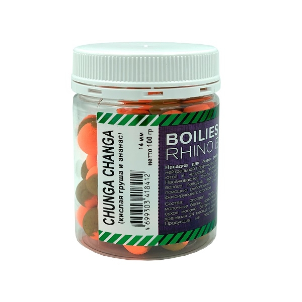 Насадочные бойлы с нейтральной плавучестью, одной из самых популярных линеек карпового питания во всем мире — Chunga Changa (кислая груша и ананас), имеющие двухцветную желто-коричневую окраску и сложный, интригующий аромат. Линейки карпового питания компании Rhino Baits – является одними из визитных карточек компании Rhino Baits, и несомненными хитами у многих рыболовов. Составной аромат краба и ананаса, с добавлением микрокапель масляной кислоты, которая является супер привлекателем для карпа, создают очень удачное сочетание, которое позволяет ловить много рыбы в абсолютно разных условиях. Для усиления привлекательности насадки рекомендуется к использованию в сочетаниях с дипами одноименной серии.
