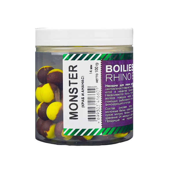 Бойлы нейтральной плавучести Rhino Baits Monster Rhino (краб и ананас), 14 мм, банка 100 грамм.
