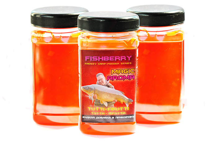Fishberry-Fadeev Magic Aroma Tutti-Frutti(тутти-фрутти) представляет собой густой по консистенции сахарный субстрат ярко-оранжевого цвета. Яркая ягодно-фруктовая ароматика данного продукта говорит о том, что создан он для ловли в летнее время с целевой направленностью приманивать карпов и сазанов. Продукт эффективен в очень жаркую погоду и на смене сезонов.