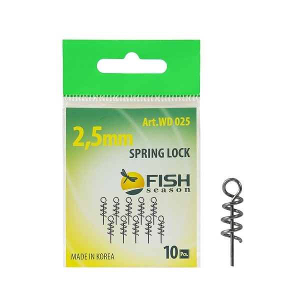 Fish Season – металлический фиксатор-спираль для деликатных силиконовых приманок. Использование данного элемента оснастки позволяет вкручивать фиксатор в тело небольшой силиконовой приманки. Такой метод крепления обеспечивает более надежную фиксацию приманки и более длительное время ее использования в монтаже с офсетным крючком и разборной джиг-головкой.