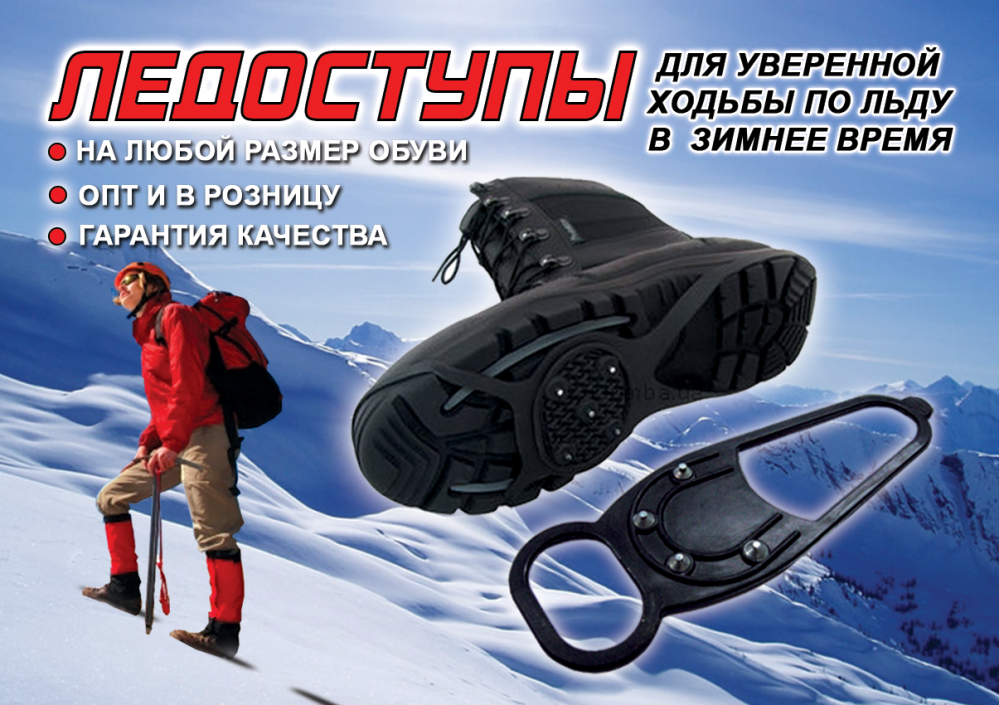 Воспользовавшись этим простым приспособлением, вы сможете избежать падений в период зимних гололедных явлений и тем самым обезопасить себя от тяжелейших травм – ушибов, вывихов и переломов. Ледоступы Зимняя Подкова – подошвы против скольжения с шипами, незаменимая вещь для пожилых людей, для которых неудачное падение грозит таким страшным последствием, как переломом шейки бедра. Как правило, вернуться к полноценной жизни пожилому человеку с таким диагнозом уже не суждено никогда. Также подошвы противоскольжения Ледоходы уберегут в зимний период от потенциальных травм беременных женщин, которым неудачное падение в конечном итоге может стоит жизни их будущего ребенка. Подошвы противоскольжения легко надеваются сверху на любую обувь (с 35 по 45 р-р). Специальный противоскользящий протектор обеспечить Вашу устойчивость на самой скользкой ледяной поверхности.