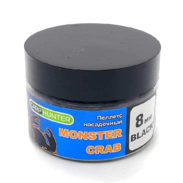 Пеллетс насадочный 8мм Black Halibut Monster Crab (Монстер Краб) CarpHunter 100мл – насадочные гранулы, имеющие отверстия, позволяющие быстро и надежно закрепить их на монтаже как в качестве самостоятельной насадки, так и в комбинации с плавающим бойлом (pop-up) без применения сверла! Попадая в воду, гранулы сразу же начинают издавать питательный вкусо-ароматический сигнал, отлично привлекающий рыбу, такую как карп, амур, карась, сом. Время растворения варьируется от 45 минут до 2 часов, в зависимости от температуры воды. При наличии в водоеме большого количества мелкой рыбы, время растворения значительно уменьшается.