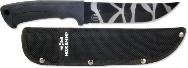 Нож нескладной H-167К "Ножемир" — надежный режущий инструмент на все случаи жизни. Изделие отлично подходит для любителей охоты рыбалки или туризма. Лезвие ножа имеет антибликовую поверхность «камуфляж», позволяющую отлично маскировать клинок и в темное время суток, и ясным днем. Изделие выполнено из прочной, нержавеющей стали марки 40х13, которая хорошо поддается заточке. Рукоять выполнена из эластрона — прочного материала, который надежно фиксируется даже в мокрой руке и не портится со временем. Рукоять ножа H-167К "Ножемир" имеет сквозное отверстие, позволяющее удобно подвесить нож на ремень или рюкзак. В комплекте также представлены ножны из кордуры для удобного хранения и транспортировки изделия.