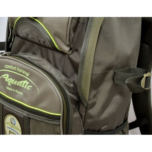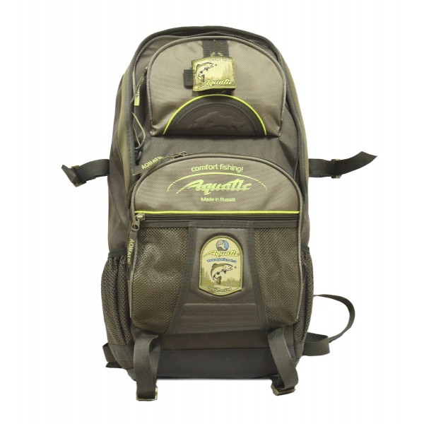 Самый популярный у рыбаков рюкзак Aquatic объёмом около 40 литров изготавливается из качественных непромокаемых материалов. Состоит из основного отделения, защищенного от влаги неопреновой лентой и 5 наружних карманов- разной функциональности. На рюкзаке возможно закрепить габаритные вещи: тубус, туристический коврик, телые вещи и т.д.