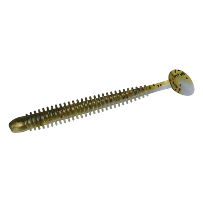 Прогонистый виброхвост-червь  очень популярной формы. Тело максимально эластичное, легкая хвостовая лопатка приходит в движение от едва уловимых потяжек удилищем. Отлично сочетается с офсетным крючком, не препятствуя надежной подсечке.  Многочисленные ребрышки на тельце создают привлекающий рыбу гидроакустический эффек­­­­т. Очень хорошо работает в стоячей воде, на медленном и среднем течении. Допускает оснащение очень легкими грузилами, а также отлично ловит в легкой прибрежной и травяной ловле вообще без огрузки. Вызывает интерес не только у классических хищников наших вод, но и регулярно приносит поимки крупной мирной рыбы – леща, сазана. Представлена в размере 4 дюйма (10 см.)