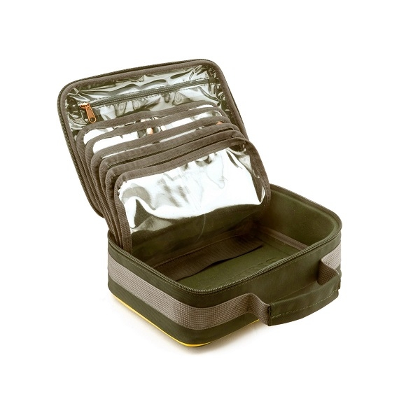 Сумка С-41 с 6 отделениями из ПВХ для готовых карповых оснасток. Для удобства использования отделения выполнены в виде съемного блока, который крепится внутри кейса с помощью липучки, а в случае необходимости легко снимается для более комфортной работы с оснастками во время рыбалки. На крышке расположен дополнительный карман из ПВХ на молнии.