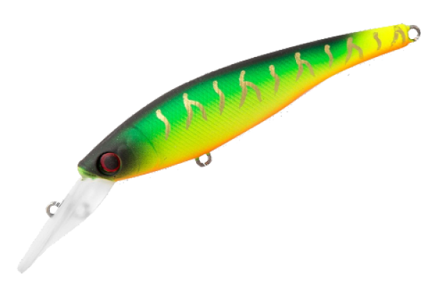 Воблер минноу TsuYoki Swim 70SP расцветка 001. Ярко-зеленый с черной спинкой и черными короткими полосками, желто-оранжевым брюшком.