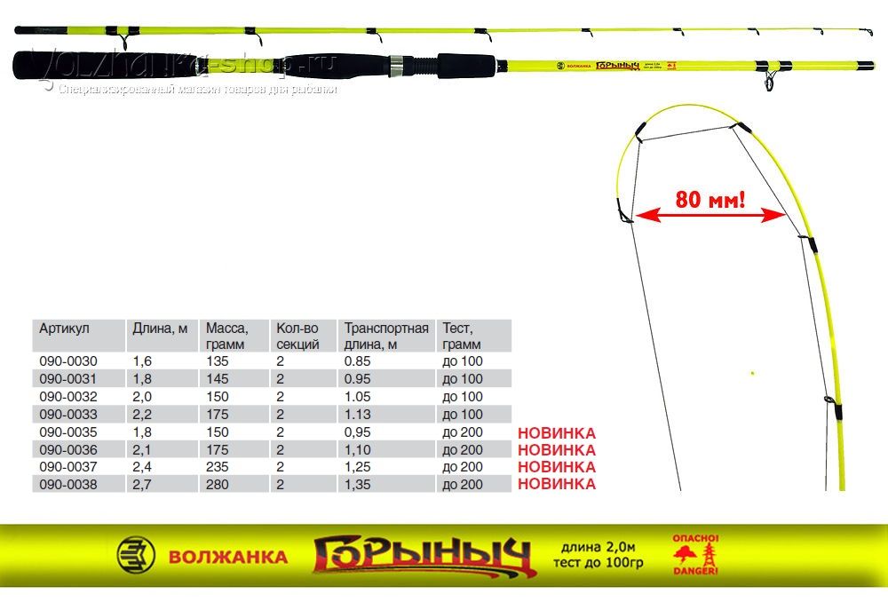 Тест введенного в линейку удилища – 200 граммов. Новый Горыныч «подрос», его длины стали – 2,1, 2,4 и 2,7 м. При этом он сохранил все достоинства и эксплуатационные свойства «младшего» собрата! По просьбам рыболовов мы увеличили диаметр входного кольца. Пожалуй, вряд ли в наших водоемах найдется рыба, способная противостоять «Горынычам».