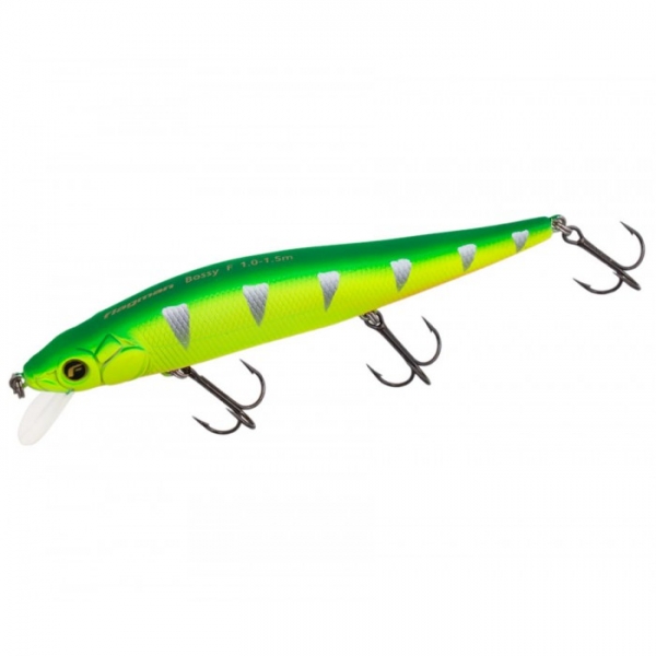 Отличная приманка для быстрого и эффективного облова обширных мелководий. Это воблер minnow вытянутой формы, весит он 14,5 г и имеет длину 110 мм. Благодаря системе дальнего заброса летит не только далеко, но и очень точно. Подвижные стальные шарики при забросе уходят далеко в хвост и сильно смещают туда центр тяжести. При первом же рывке они возвращаются на место и фиксируются специальным приливом снизу, благодаря чему при проводке балансировка остается неизменной. Шарики издают относительно негромкий звук высокой частоты. Воблер обладает собственной игрой, но равномерная проводка не выступает основной, его специализация – твичинг. При рывках Bossy совершает длинные «заплывы» по инерции, имеющие сложную траекторию. Причем, он сразу резко отклоняется в сторону, и амплитуда его движений получается очень большой. Bossy – суспендер, после остановки движения он зависает в толще воды. Длительные паузы нередко провоцируют на атаку щуку и крупного окуня. Лобовое сопротивление воблера не слишком велико, поэтому для рывковой проводки нет необходимости использовать сверхжесткие удилища.